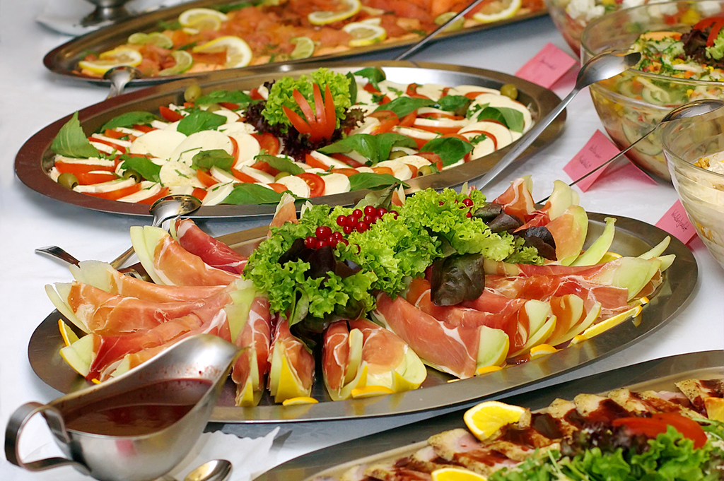 Poulardenbrust mit Currysoße, Mandelschnitzel, Rollschinken auf Melonenschiffchen, Forellenfilet mit Meerrettich-Sahne, Lachsspezialitäten, Käseauswahl, Geflügelsalat, Broccoli-Schinken-Salat, verschiedene Brotsorten, Partybrötchen und Butter