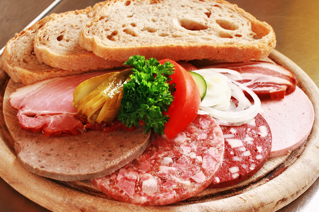 reichlich belegte Brote mit Schinken, Braten, Mettwurst, Pute, Käse und Mett